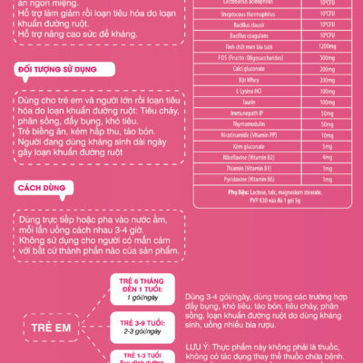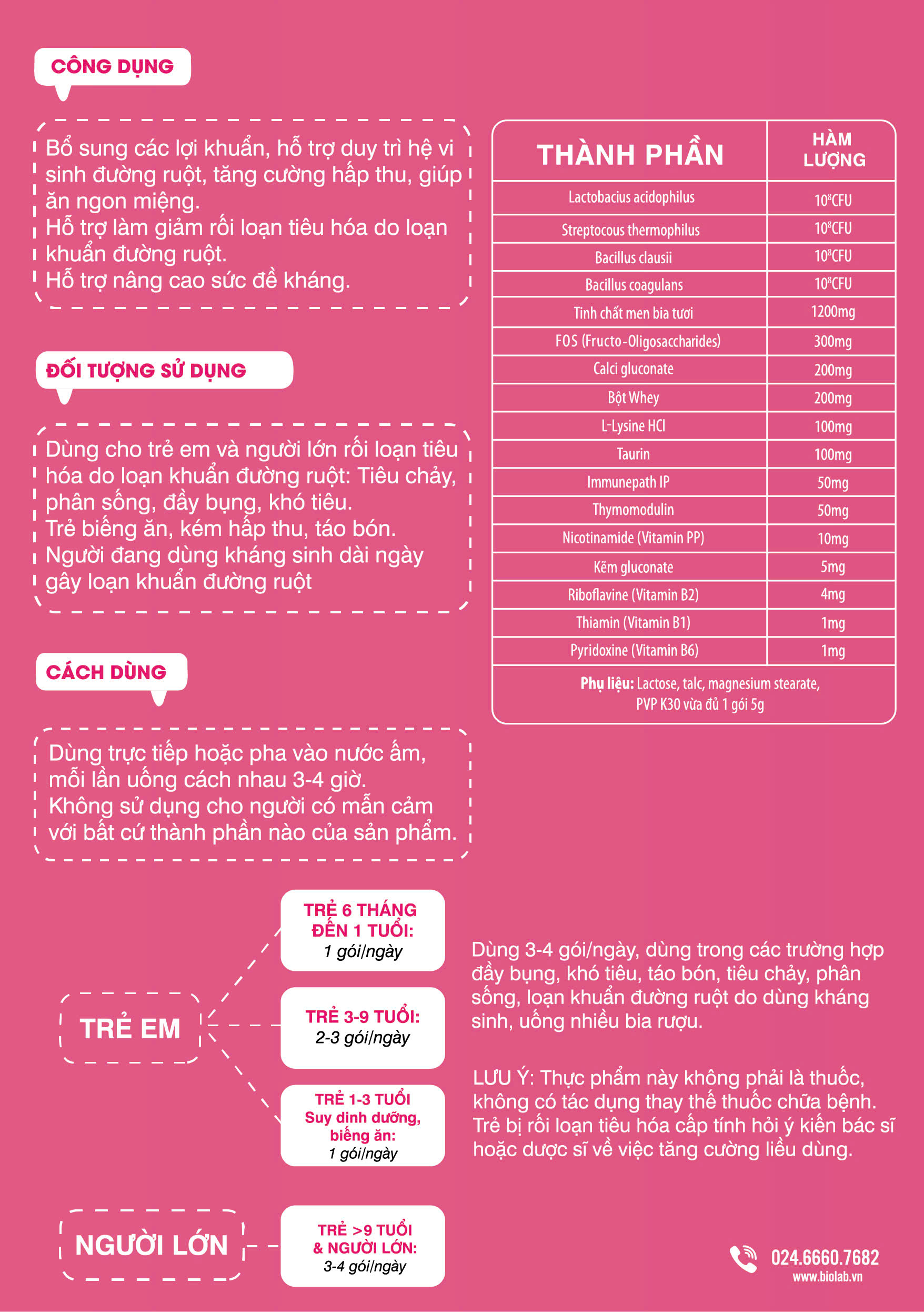 • Dùng cho trẻ và người lớn rối loạn tiêu hoá do loạn khuẩn đường ruột: Tiêu chảy, phân sống, đầy bụng, khó tiêu, táo bón.